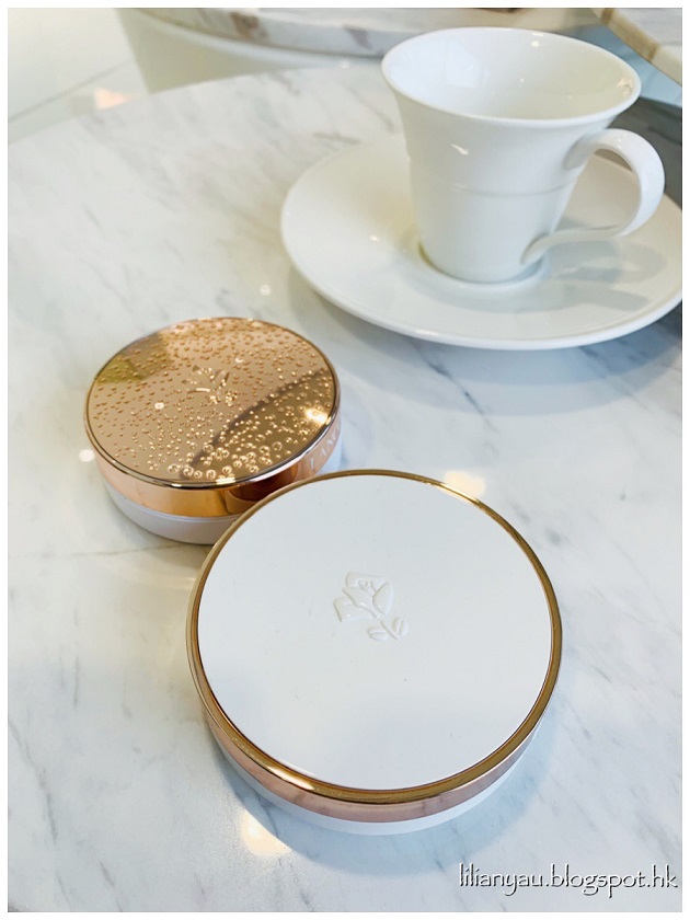純白粉盒上有Lancôme玫瑰標誌,綴上奢華的金色圍邊,原來這是專為亞洲市場而設計的,很高貴雅緻呢❤